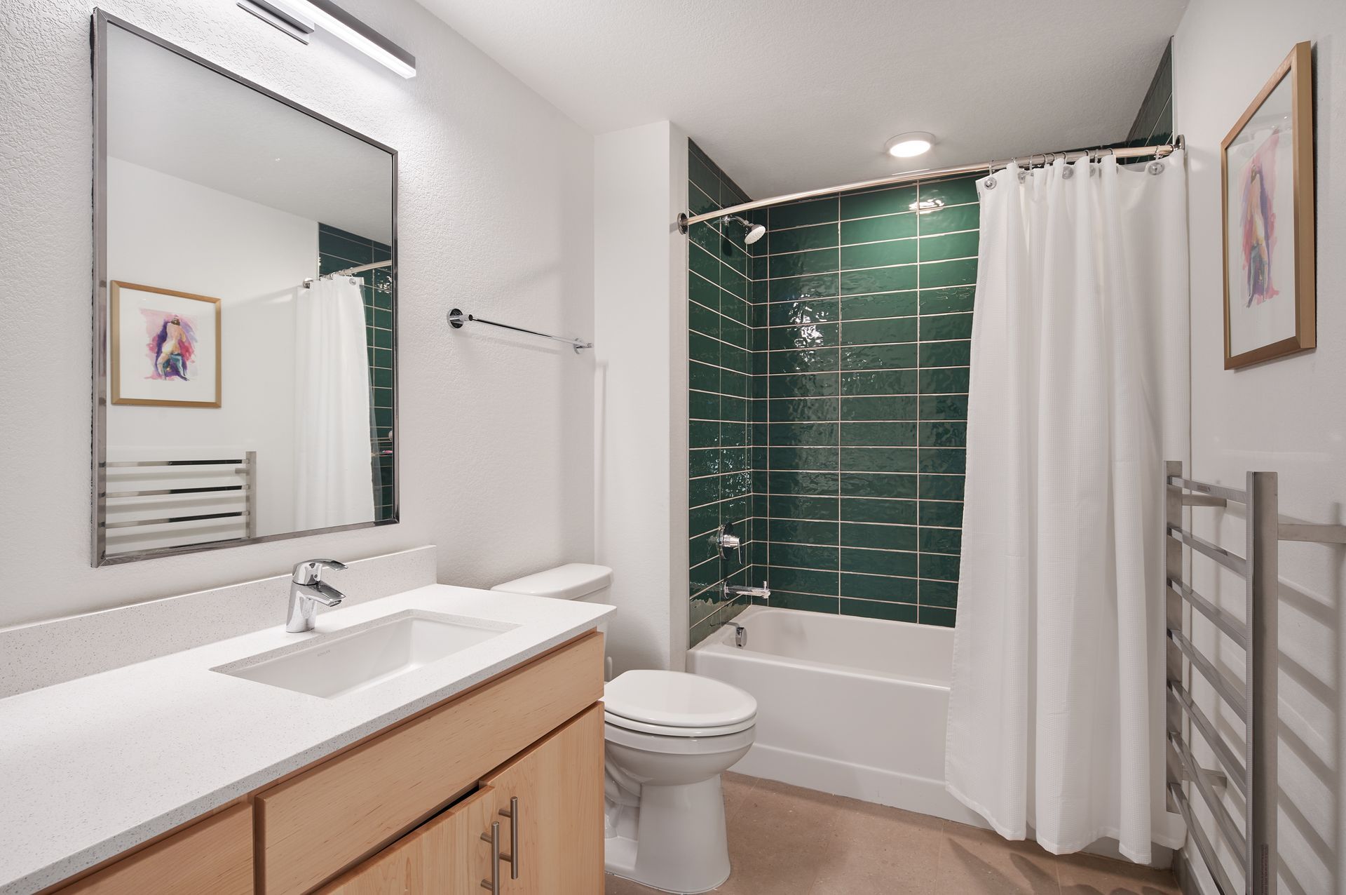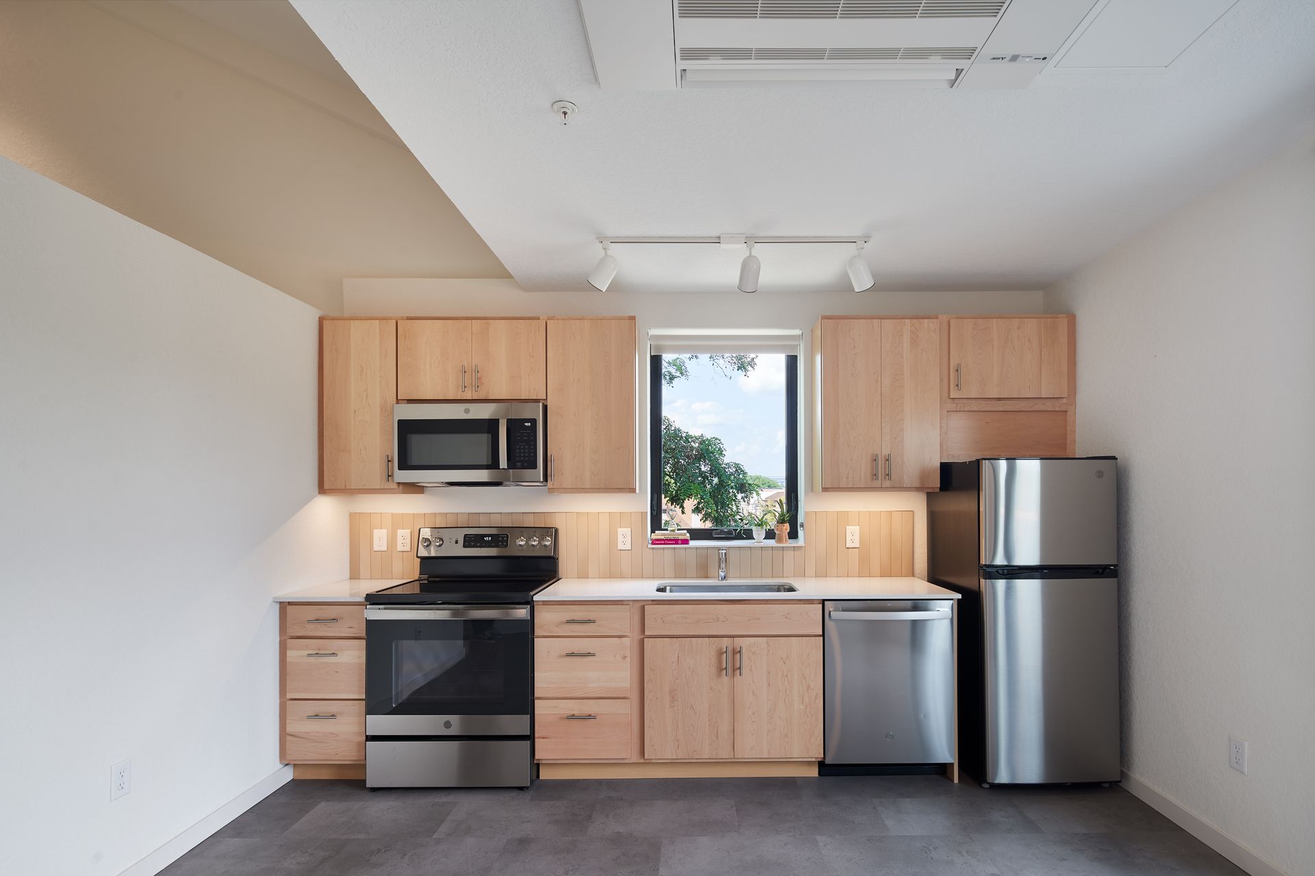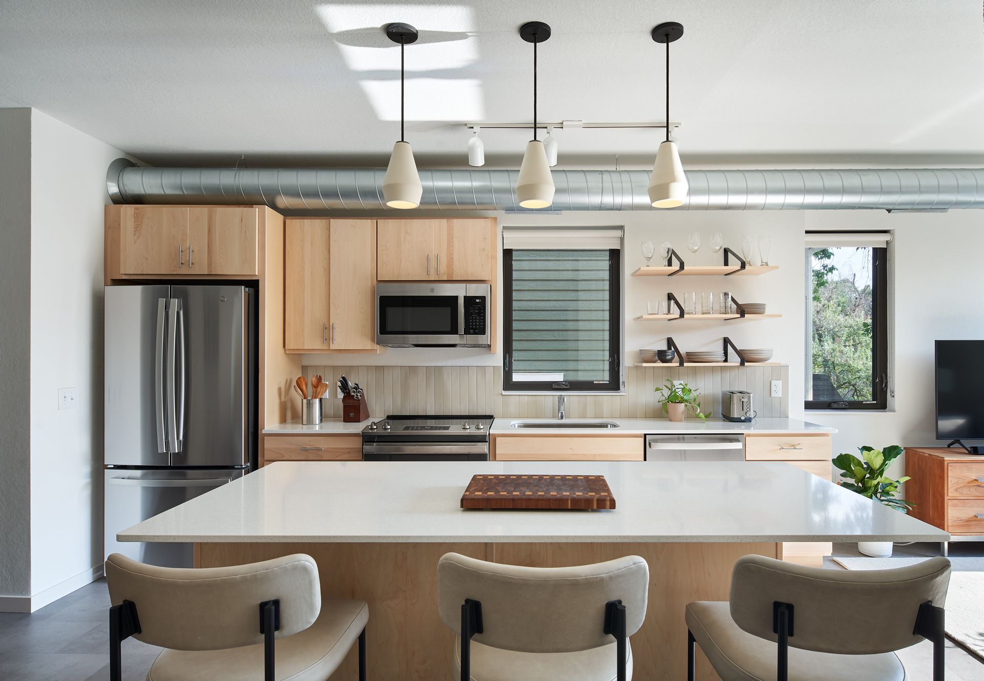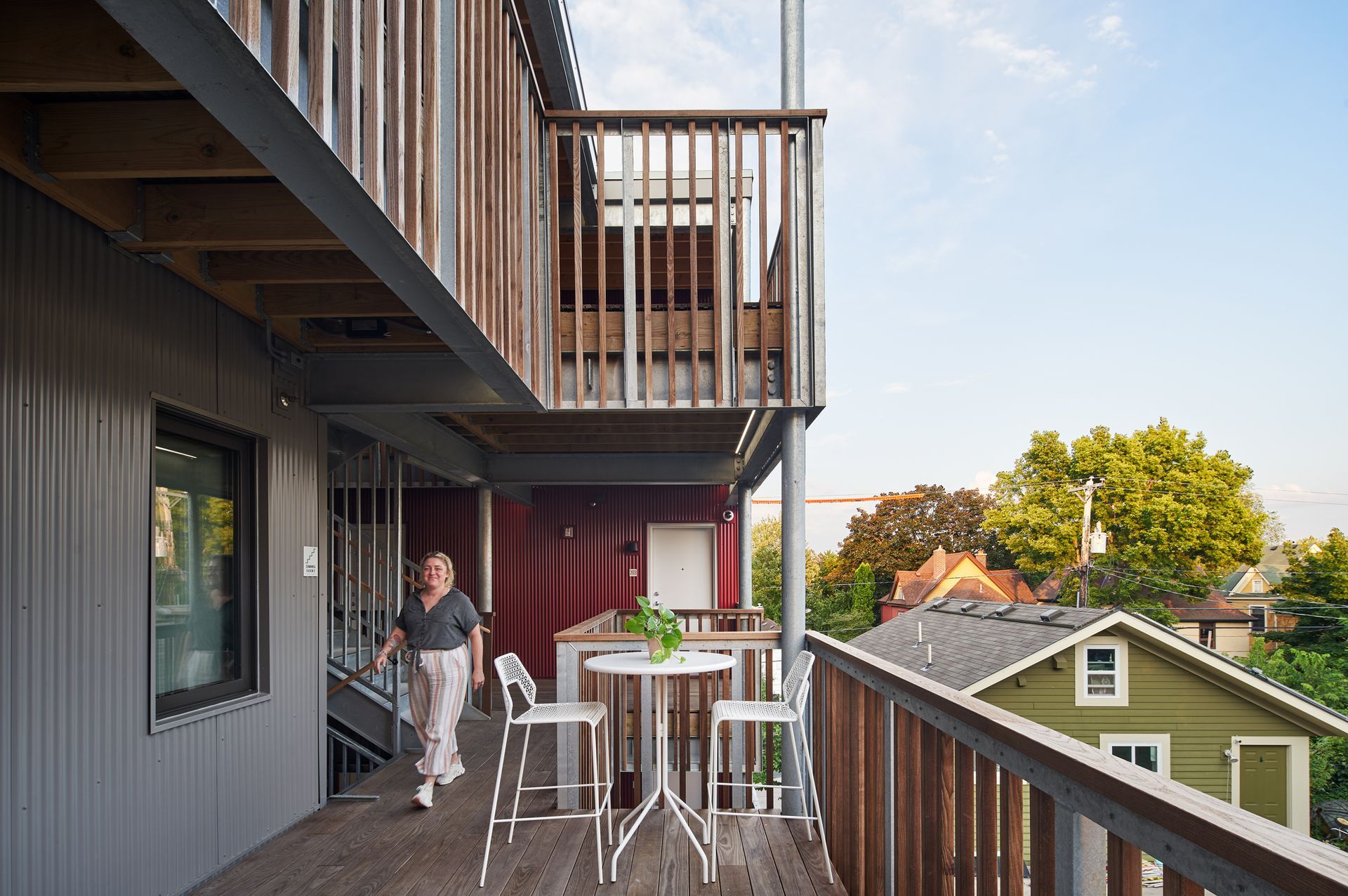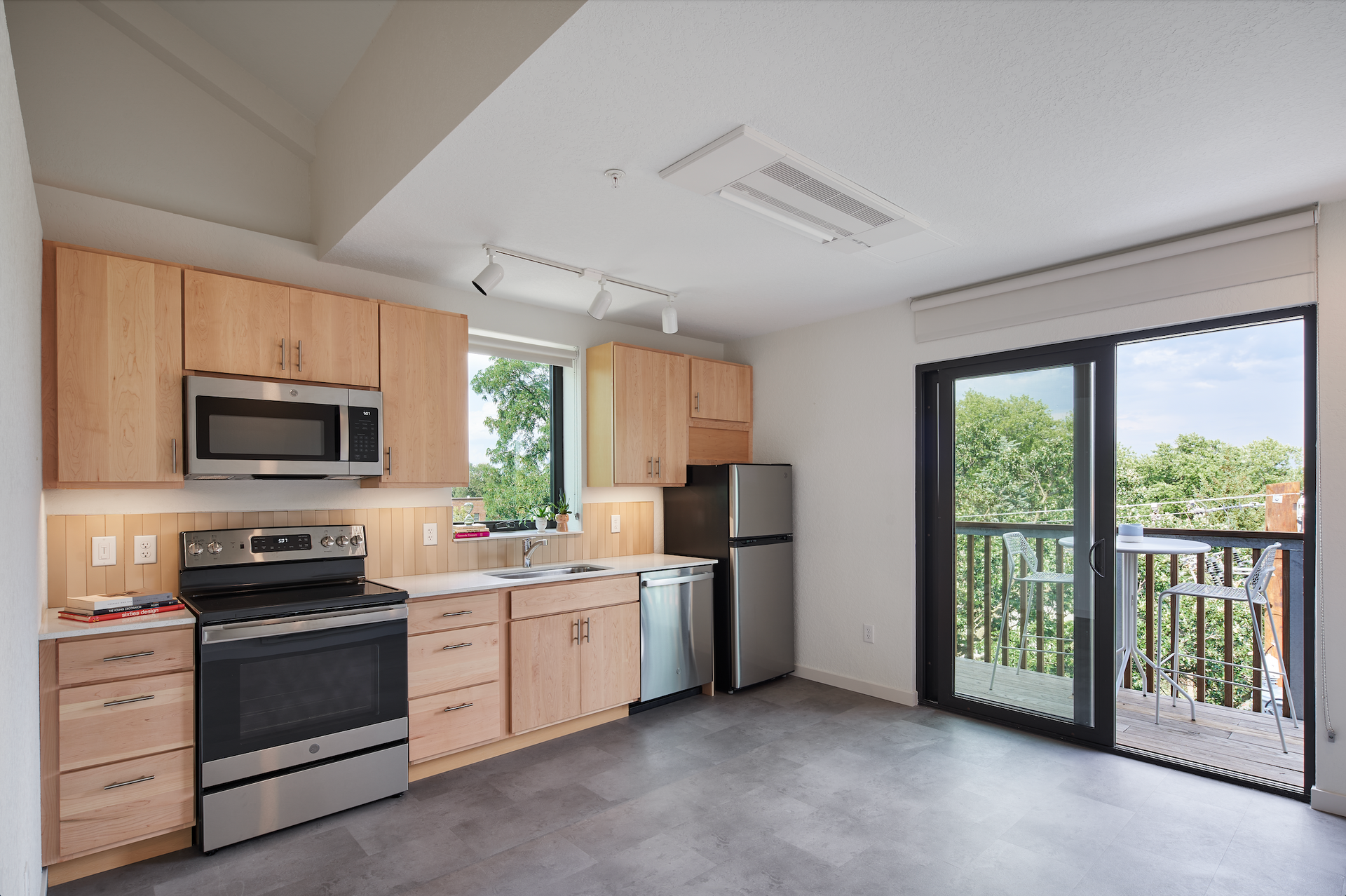 Designed and built with sustainability and convenience at the forefront. The building is completely electrified, which eliminates the use of fossil fuels. There is also an extensive solar array on the roof to provide renewable energy. The building features an elevator for accessibility and exterior circulation pathways to allow full access to natural light and fresh air.